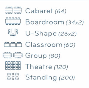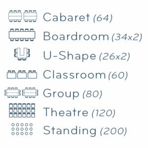Onze belangrijkste evenementenruimte is geschikt voor maximaal 200 gasten. Als je meer gasten hebt, kun je de evenementenruimte combineren met onze woonkamer, restaurant, bar en andere ruimtes op het dak, afhankelijk van de opstelling. De flexibiliteit en opties zijn eindeloos!